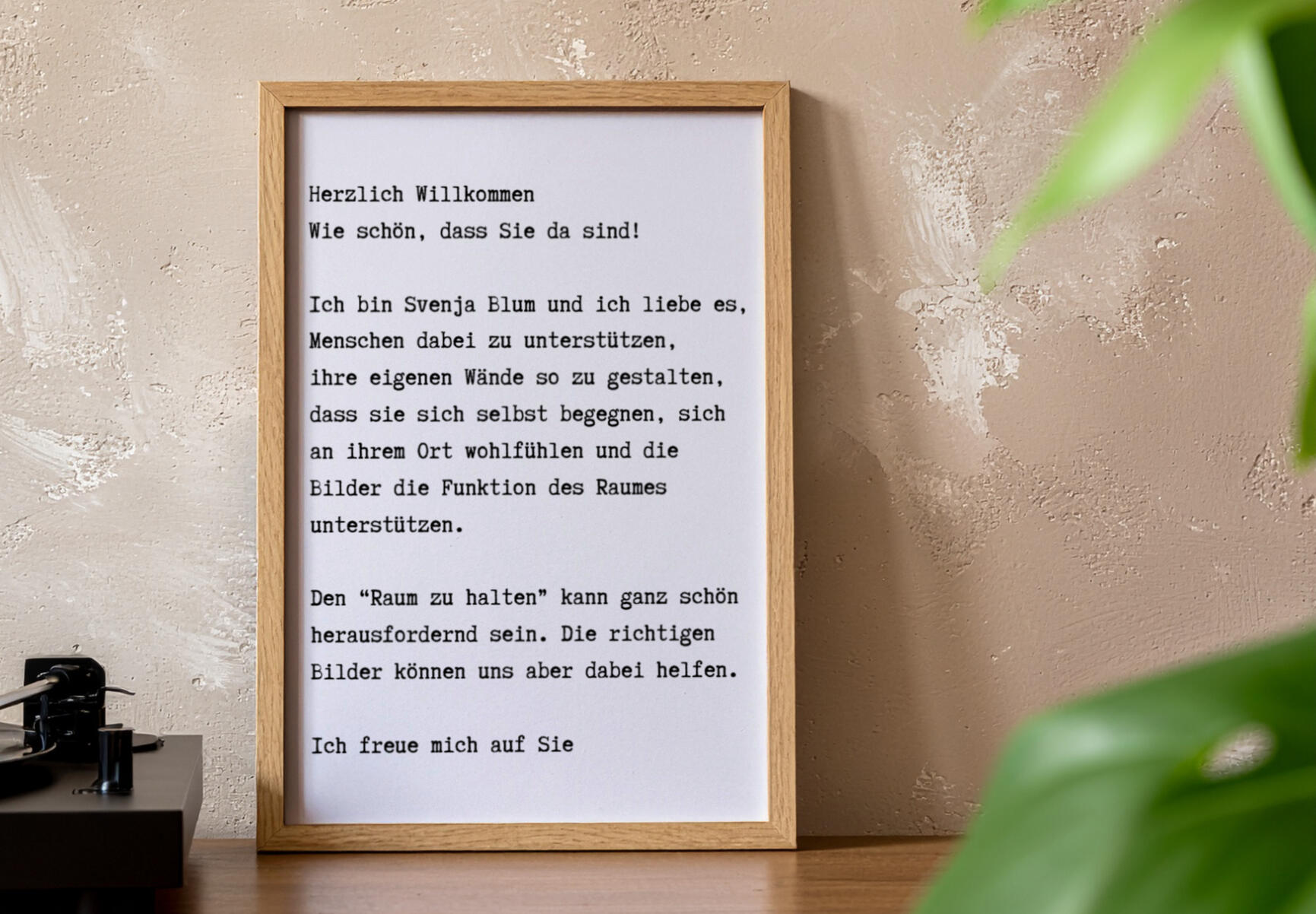 Wer ich binMein Name ist Svenja Blum.Die Wirkung von Bildern im Raum fasziniert mich seit vielen Jahren – sowohl im privaten als auch im professionellen Kontext. Bilderwände sind für mich kuratierte Kompositionen, die viel mehr sind als Dekoration: Sie schaffen Präsenz, spiegeln Werte und verleihen Räumen Tiefe.Besonders in therapeutischen Kontexten faszinieren mich die Zwischentöne – das, was nicht laut spricht, aber spürbar wirkt. Gute Therapie ist für mich eine Form von Kunst. Und diese darf sich im Raum ausdrücken: zurückhaltend, authentisch, vielschichtig – aber nie klischeehaft.Als Kommunikationsdesignerin (B.A.), Künstlerin und Kunstlehrerin (M.Ed.) stoße ich immer wieder auf die Frage, wie sich der weiße Raum bespielen lässt. Ganz egal, ob auf Papier oder auf Fluren in einer Schule, mich interessiert das Zusammenspiel aus grafischer Komposition und inhaltlicher Tiefe, das etwas in uns zum Schwingen bringt.Schreiben Sie mir jetzt für ein unverbindliches Erstgespräch.